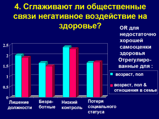 существенна. Можно ожидать, что в том случае, когда отношения в семье приводят к финансовой и другой поддержке, они уменьшают негативное воздействие потери и ухудшения работы на здоровье. Если семейные отношения дают эмоциональную поддержку, они могут уменьшить воздействие контроля или ухудшения социального статуса на здоровье. Но механизм этого не вполне ясен. Также следует отметить, что это исследование - перекрестное, и мы не смогли выявить обратную обусловленность, когда семейные отношения приводят к ухудшению здоровья. |