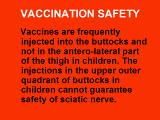 became crippled due to such unsafe practices. In fact not only vaccines, but also other injections can cause such injury. It seems also that antibody response is lower when injection is made into the gluteal region. So almost everyone recommends that buttocks should be avoided for intramuscular injections in children. In addition to abovementioned, only few nurses and doctors aspirate after insertion of the needle. So it is not clear what type of injection is done - intramuscular or intravenous. If vaccine follows IV route than we should expect that the effectiveness of the intervention will be low. Safety also could be a problem. This is true not only for vaccines but also for other injections, except Penicillin G benzathine and few others. |