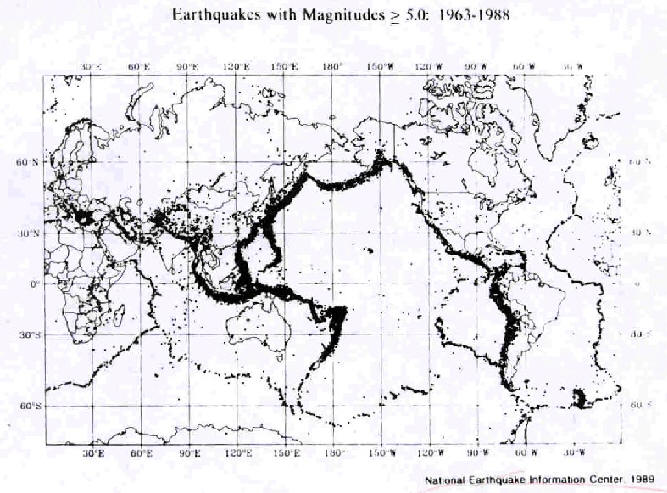 This U.S. Geological Survey map depicts earthquakes in the world with magnitude > 5.0: 1963-1988. National Earthquake Information Center, 1989.