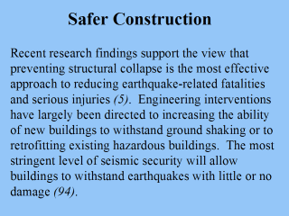 errors in construction are avoided in the future. A building may still fail in an earthquake, but injuries may be prevented or reduced if those parts of the building likely to be occupied by large numbers of people can be designed in such a way that there is less risk of injury to the occupants (95). It may be possible to design buildings so that if they do "fail," they collapse in such a manner that occupants have the best possible chance of being rescued (96). For example, almost all types of damaged buildings will contain voids or spaces in which trapped people may remain alive for comparatively long periods of time. The design of new buildings could incorporate features such as a structural core or deep-beam structure that is believed to produce more potential safe spaces or voids for entrapped victims following complete or partial collapse. |