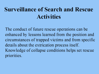 prove helpful when extricating casualties. Ideally, search and rescue teams should have surveillance forms to record important information, including the building type, the collapse site address, the nature of the collapse, the amount of dust present, the presence of fire or toxic hazards, the location of victims, and the nature and severity of injuries. Victims pronounced dead at the scene should be tagged with an identification number so that the medical examiner's data can later be linked to the search and rescue surveillance form. Surveillance of search and rescue activities should be used to direct resources to sites where the most good can be done in the first 24-48 hours--the most critical time. |
