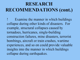 earthquakes. ! Identify the cultural and socioeconomic determinants of earthquake injury. For example, despite the potential hazards associated with unreinforced masonry buildings, such buildings frequently offer the only affordable shelter for economically and socially disadvantaged residents and marginal minority businesses. Therefore, we should direct research at developing architectural, administrative, and managerial hazard-reduction techniques that are tailored to reduce the risks of different ethnic minorities in earthquake-prone areas of the country. ! Attempt to determine worldwide and by country or disaster-prone area 1) the proportion of people who are effectively protected at that moment by aseismic buildings, both at home and in the workplace and 2) the cost of providing complete protection for the population in question (137). |