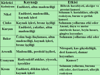 | Tablo II. Hava, su, toprak kirliliğine neden olan bazı ağır metaller, kaynakları ve etkileri(1,2,3,4) |
