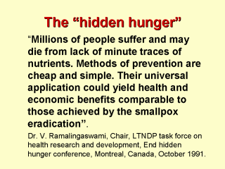 retardation, learning disabilities and low work capacity. The first milestone in tackling micronutrient deficiency was the study by the USAID showing that Vitamin A deficiency may be responsible for increased mortality in children. Ref: Sommer A, et al. Lancet 1986; I: 1169-73. |