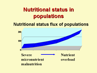 The nutritional status of populations is in a flux. Groups within the population are moving along a continuum of nutritional risk, extending from severe micronutrient malnutrition, through several steps and levels of presumed nutritional adequacy, to the other extreme ; nutrient overload and toxicity. At both ends of the continuum, under and over nutrition, diseases and difficulties affect the populations and persons involved. |