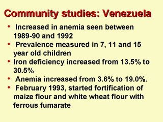 Evaluation was performed in 1994 Iron deficiency decreased to 15.8% Anemia decreased to 9.3% Conclusion: Can improve iron status in 12-18 months via fortification of foods. Readings: Layrisse et al. Early responses to the effect of iron fortification in the Venezuelan population. Am J Clin Nutr 1996; 64: 903-7. |