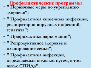 туберкулеза"; "Профилактика алкоголизма и курения"; "Рациональное питание"; "Физическая активность"; "Профилактика травматизма" ; Проекты в рамках ВОЗ: "Здоровые города"; "Школы здоровья"; "Здоровые университеты"; "Больницы здорового образа жизни"; "Здоровые рабочие места". |