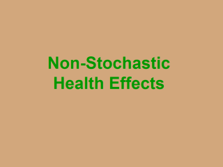 Many non-cancerous health effects of radiation are non-stochastic. Unlike cancer, health effects from 'acute' exposure to radiation usually appear quickly. Acute health effects include burns and radiation sickness. Radiation sickness is also called 'radiation poisoning.' It can cause premature aging or even death. If the dose is fatal, death usually occurs within two months. The symptoms of radiation sickness include: nausea, weakness, hair loss, skin burns or diminished organ function. Medical patients receiving radiation treatments often experience acute effects, because they are receiving relatively high "bursts" of radiation during treatment. |