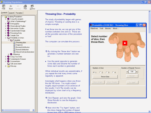 Explanatory text and instructions for use of the exercise is given to the right of the contents list and the interactive exercise is to the right of the text. The text can be scrolled either with the scroll bar on the far right of the window or with a scrolling mouse wheel. |