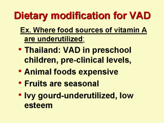 Method: - Intensive social marketing (advertising) - Promotion within the community - Recipe menus for school and family meals - “Ivy Gourd Man” promotion and exposure - All levels of the community involved Result: - Increased use & consumption of vitamin A rich foods,use of fats/oils in the preparation of ivy gourd - Decreased prevalence of night blindness - No change in serum retinol levels (may be due to technical problems) - Drawback: program could not be sustained Readings: Smitasiri et al. Participatory action for nutrition education: social marketing vitamin A-rich foods in Thailand. Ecol Food Nutr 1992:28;199-210.
