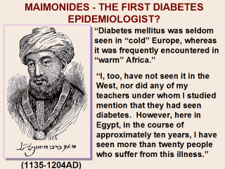 Introduction The great ancient physician and Talmudic scholar Maimonides (1135-1204) may well deserve credit as the first diabetes epidemiologist! He observed in his travels that diabetes was seldom seen in "cold" Europe where as it was frequently encountered in "warm" Africa (1). However, indisputably, it was Kelly West’s book the "Epidemiology of Diabetes and its Vascular Complications" (2) published in 1978 which saw epidemiology of diabetes coming of age. The book with its over 2300 references brought together most of the contributions, clinical and population-based on the subject of diabetes epidemiology and highlighted the many gaps in our diabetes epidemiology knowledge at that time. At the time, West wrote that even he didn’t realize that his own research constituted epidemiology until he was informed of this by a "real" epidemiologist in 1966! (2) |