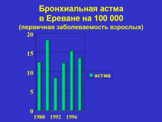 установились недопустимые нормы формальдегида и бензола. Из-за смены типа отопительной системы в Армении вырос уровень загрязнения воздуха внутри помещений. Одновременно возросло количество патологий дыхательных путей, влияющих на уровень смертности (рак легких, бронхиальная астма), и повысился уровень мертворождаемости и младенческой смертности. |