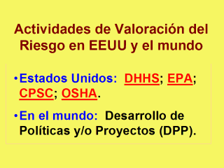 El primer grupo consiste en todos aquellos riesgos a la salud para los cuales, la mitigación depende de la iniciativa individual o de un esfuerzo de organizaciones médicas, en vez de intervenciones gubernamentales. Este grupo está a cargo del Departamento de Salud y Servicios Humanos de EEUU (DHHS). La segunda categoría se encarga de aquellos riesgos a la salud que están sujetos a control regulatorio y están relacionados principalmente a la contaminación ambiental o al uso de productos. Este grupo esta a cargo de la Agencia de Protección Ambiental de EEUU (EPA). Otras agencias regulatorias incluyen la Comisión de Seguridad de Productos al Consumidor de EEUU (CPSC) y la Administración de Drogas y Alimentos del DHHS. La tercera categoría difiere del segundo grupo solamente en que el riesgo se debe a exposiciones ocurridas en el trabajo. Éste está sujeto al grupo de control regulatorio de la Administración de Seguridad y Salud Ocupacional (OSHA), la cual es parte del Departamento de Trabajo de EEUU. La cuarta categoría incluye a todos aquellos riesgos para la salud creados o agravados por políticas o programas de desarrollo (PPD) o por la industrialización, especialmente en países en desarrollo. Se cree irónicamente que las PPD y la industrialización mejoran las condiciones económicas publicas y los estándares de vida. |