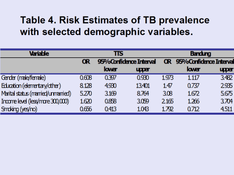 | In TTS, the probability of married people getting TB was 5 times higher than single people (95% CI; 3.169 – 8.764) while in Bandung it is 3 times higher (95% CI; 1.672 – 5.675). The probability of respondents with elementary education getting TB is 8 times higher than others (95% CI; 4.9 – 13.4). Income level show the significant association only in Bandung. In both districts smoking status show no significant association with TB prevalence. |