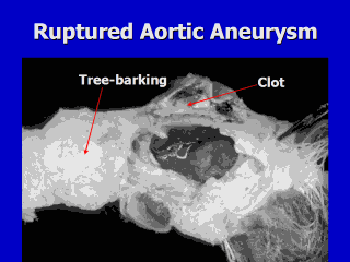 | This is a large, ruptured syphlitic aneurysm of the ascending aorta. Note the laminated clot between the tunica media and the adventitia, and the characteristic tree-barking of the intima distal to the aneurysm. |