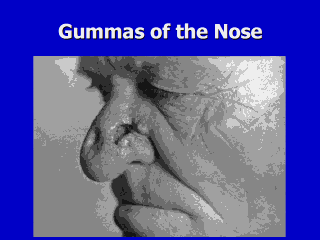 | Gummas may mimic other conditions; this patient was initially thought to have basal cell carcinoma of the nose. With appropriate treatment, gummas will heal, often with surprisingly little residua. |