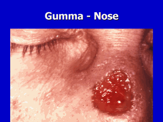 | This is a gumma of the nose. Treponema pallidum grows better at somewhat lower temperatures, a probable reason for preferential distribution of lesions in anatomic areas that are cooler than core body temperature. |