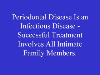 The infectious disease nature of periodontitis is critical to understand and implement in clinical practice. We have noted many cases where spouses can reinfect each other and published data support this finding. Failure to account for this factor will reduce success rates considerably. In our practice, all adults are screened and children with any symptoms are screened for anaerobic infections. Culture testing is not used routinely for screening but can be helpful for refractory or nonresponsive infections. Newer tests are now available such as the Diamond Probe which measures sulfides in the periodontal pocket environment which can indicate proteolysis or active tissue destruction. As this and other testing becomes available and economical, the microbiologic risk analysis should become easier and less disruptive to the clinical routine. Patients will benefit because health professionals will make better prognostic decisions. Treatment will become more predictable and outcomes will be better than previous modes of treatment. |