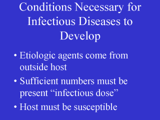 1) the etiologic agents must come from outside the host organism through the portal of entry some time prior to development of symptoms. 2) the must be present in sufficient numbers to initiate disease activity (infectious dose). 3) the host must be in a susceptible state for the infection to develop. Infectious disease conditions for periodontitis are met in the following