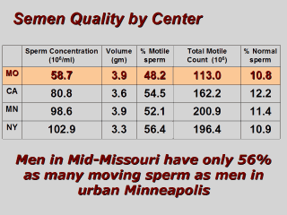 In this slide the mean values for all semen parameters are compared. The contrast between centers can best be summarized using Total Motile Count, or the number of moving sperm, which is equal to the product of sperm concentration, sample volume and sperm motility. |