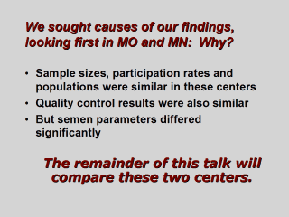 After ruling out non-causal explanations for the differences we had observed, we looked for causal agents that could have led to poor semen quality in mid-Missouri relative to the three urban centers. In what follows, I will compare Minneapolis, Minnesota and Columbia, Missouri, two centers whose populations are similar in sample size and demographics, but very different in semen quality. |