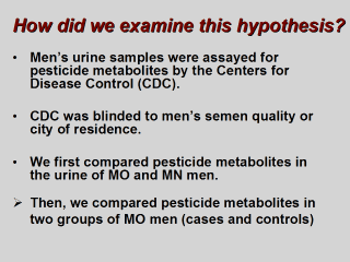 In order to examine this hypothesis we looked for pesticide levels in the urine samples that men had given when they provided their semen samples. The Centers for Disease Control (CDC) conducted these analyses and were unaware of the men’s semen quality or where they lived. First, we compared urinary metabolite levels of 15 current-use pesticides in a sample of men from Missouri and Minnesota. |