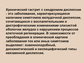 | Язвенноподобный ее вариант диагностируется в случае преобладания в клинической картине болевого синдрома, напоминающего боли при язвенной болезни. Для дискинетического варианта характерны традиционные признаки синдрома желудочной диспепсии: чувство переполнения, дискомфорта в эпигастральной области после приема пищи, тошнота и др. При неспецифическом виде диспепсии идентифицировать ведуций клинический признак не удается. |