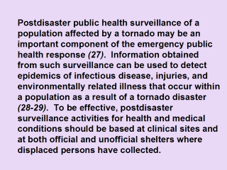 | In addition, using a standard shelter surveillance form, relief agencies such as the American Red Cross collect data on the status of victims living in shelters (30). Therefore, epidemiologists conducting postdisaster surveillance should coordinate surveillance and other data collection activities with all relief agencies and with state and local public health authorities. |