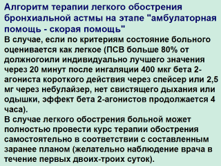 обострении бронхиальной астмы легкой степени рекомендуется: 1. Продолжать ингаляции бета 2-агонистов каждые 3-4 часа в течение 1-2 суток. 2. Для профилактики приступов одышки необходимо назначение или изменение противовоспалительного лечения: ингаляционные кортикостероиды в средних или высоких дозах, если пациент не получал их ранее, или увеличение дозы ингаляционных глюкокортикостероидов в 2 раза, если больной уже принимал их. 3. Пациент должен находиться под амбулаторным наблюдением пульмонолога или терапевта для контроля за эффективностью терапии. |