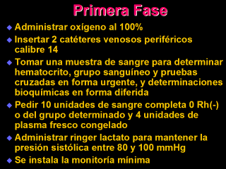 Las primeras medidas son: - administrar oxígeno al 100% - insertar 2 catéteres venosos periféricos calibre 14 - tomar una muestra de sangre para determinar hematocrito, grupo sanguíneo y pruebas cruzadas en forma urgente, y determinaciones bioquímicas en forma diferida - pedir 10 unidades de sangre completa 0 Rh(-) o del grupo determinado y 4 unidades de plasma fresco congelado - administrar ringer lactato para mantener la presión sistólica entre 80 y 100 mmHg - preparar bomba de infusión con dopamina y con nitroglicerina - se instala la monitoría mínima |