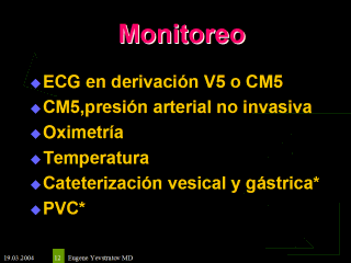| *Como monitoría mínima, puede partirse con ECG en derivación V5 o CM5,presión arterial no invasiva, oximetría y temperatura. Si hay tiempo, y generalmente es así, conviene partir con PVC a través de un catéter yugular y presión arterial directa. Después de inducida la anestesia se debe realizar la cateterización vesical y gástrica. |