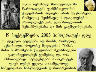 hipokrates mokle biografia hipokrate (Cv.w.aR-mde 460-377 ww. ?) iyo gamoCenili berZeni eqimi. mcire ram aris cnobili misi cxovrebis Sesaxeb, garda imisa, rom is cxovrobda kunZul kosze berZnuli kulturis yvelaze inteleqtualur periodSi da Tavisufali iyo yovelgvari crurwmenisagan. hipokrates saxelTan asocirebulia 80 traqtatze meti, magram amJamad iTvleba, rom zogierTi maTgani dawerilia sxvebis mier, romelnic amoefarnen hipokrates saxelsa da reputacias. hipokrates mier Seqmnili Txzulebebi Seadgendnen 10 toms, romelic misi sicocxlis periodSive cnobili gaxda medicinisa da qirurgiis enciklopediis saxeliT. hipokrates moixsenieben rogorc mecnieruli medicinis mamas. mas ar sjeroda mistikuri daavadebebis an saswaulebrivi gankurnebis. is aswavlida, rom swori dieta janmrTelobis sawindaria. aseve did mniSvnelobas aniWebda klimats da mis gavlenas rogorc adamianis sxeulze, aseve gonebaze. is gardaicvala TesaliaSi xandazmul asakSi. http://www.sacklunch.net/biography/H/Hippocrates.html 19 seqtembers saberZneTSi aRniSnaven hipokrates dRes. Cven gvaqvs winadadeba, rom es dRe aRiniSnos mTel msoflioSi rogorc profilaqtikis msoflio dRe. Cven gvsurs 2003 wlis 19 seqtembers gavaerTianoT hipokrates samedicino da qalRmerT higias profilaqtikuri koncefciebi. higia iyo janmrTelobis qalRmerTi, romelic iyo mamamisis asklepiosisa (eskulapis) da aseve qalRmerT afrodites Tanamgzavri. hipokratesa da higias kavSiri SeiZleba SevadaroT energiis ori formis ianisa da inis kavSirs. hipokrateze damatebiTi informaciis misaRebad SegiZliaT mimarToT Semdeg saits: http://www.allsands.com/Science/hippocratesbiog_rtb_gn.htmes slaidi Seqmnilia globaluri janmrTelobis qselis "superkursis" jgufis mier. |
