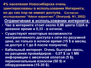 Новосибирске (Навигатор, 31.08.2001) Несмотря на эти противоречия, работая в основном в режиме "off line", россияне развивают различные области Интернета. За 2001 год в России отмечен 42% рост числа персональных компьютеров. IDC информирует, что спрос на новые компьютеры в России в последнем квартале 2001 в первый раз превысил наивысший показатель спроса последней четверти 1997, который составлял 483 000 computers. A.Кондратьев, A.Роткин "Убедительный рост", Эпиграф, Март 2002 N8, стр10 |
