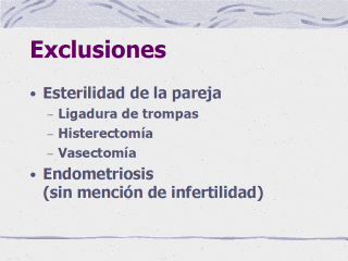 Mujeres con diagnóstico de endometriosis sin mención de fertilidad fueron excluídas. |