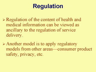 One model is for the agencies that regulate traditional health and medicine products and services to also regulate the information about those products and services. The Food and Drug Administration can regulate the form and content of information about pharmaceuticals, the state license boards can regulate the advertising of doctor’s services, and so on. An alternative approach is to include health and medicine with other products and services and apply general regulatory approaches to areas such as safety and privacy. Whatever the approach, there are ethical, legal, and other policy concerns underlying the regulation. |