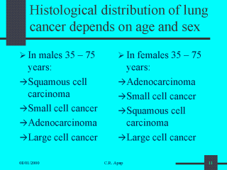 In the age group 35-75 years, squamous cell carcinoma is the most frequent type of lung cancer in males, wheras adenocarcinoma is the most frequent of lung cancer in females. Large cell cancer is the less frequent type in both sexes. In men below 60 years, adenocarcinoma is relatively common. |
