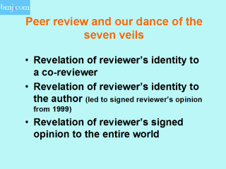 remains itself remarkably untouched by the rigors of science. Lots of bad things: slow subjective, prone to bias, por at detecting gross defects, useless at detecting fraud. Starting with an ethical stance shouldn't be made in private; certainly continuation of the asymmetrical power relationships that exist between reviewer and reviewed. 471 papers post entire publication prehistory The last veil: We may move to a system where authors and readrs can watch the peer review system on the world wide web as it happens and contribute their comments. First attempt was th conservative: if reviewer is blind the author must be too. Removing author's details didn't improve quality of opinion RCTs |