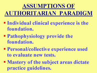 This slide summarizes the basic assumptions of the authoritarian paradigm.