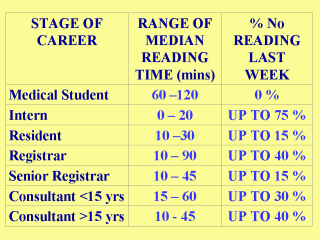 In a survey, conducted at Grand Rounds at various United Kingdom Hospitals, a researcher has found that, among senior Consultants, up to 40% of them would not have done any reading in the previous week, prior to the survey, compared to up to 75% of Interns, having done no reading in the previous week, prior to the survey. It is ironic that the Interns who need the teaching do not do their own reading, and the senior staff, who are supposed to be teaching them, are not doing it either. |