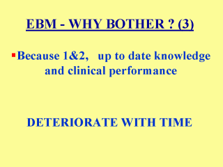 3. Due to the fact that new types of evidence are being generated and the fact that we fail as clinicians to get the appropriate evidence, up-to-date knowledge and clinical performance deteriorate with time. Continued in next slide…