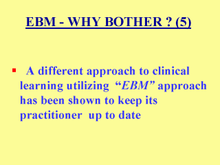5. A different approach to clinical learning (using an Evidence-Based approach) has been shown to keep its practitioner up-to-date. This was exemplified when a graduate of a medical school that adopt a problem-based learning and evidence based approach to teaching is compared to a graduate of more traditional medical schools. Continued in next slide…
