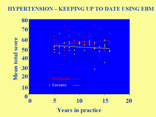 The performance of the group graduating from schools adopting EBM approach (McMaster) , over time, was significantly better than the group graduating from a more traditional school (Toronto). |