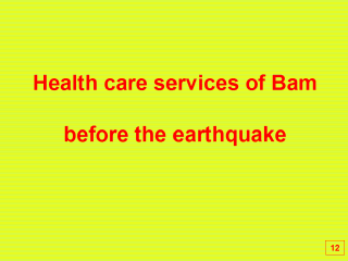 | Health care services to the people in Bam District were provided by 95 Health Houses, staffed by primary healthcare workers (Behvarz) as the first level care providers, and 24 Health Centres (14 rural, and 10 urban) as the second level care facilities. Third level care services were delivered through three hospitals; two public and one private, with a total of around 255 beds altogether. |