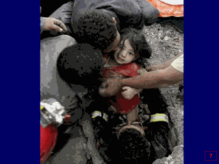 post-disaster, about 10 % were hopeful to find their relatives alive under the rubble and asked for rescue efforts. You see here the picture of a 6 year old beautiful girl, who had been rescued on the 13th day after the quake. She and her 12 year old sister had been entrapped in the kitchen and fed by some of available food. |