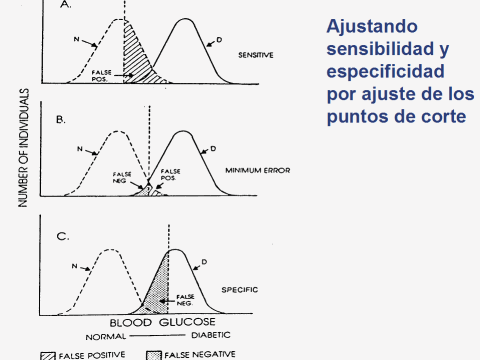 falsos positivos Sensitive = sensible false neg = falsos negativos N= normal D = diabético Minimum error = error mínimo Specific = específico Blood glucose = glucosa en sangre Diabetic = diabético Number of individuals = número de individuos |