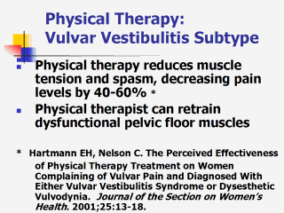 | (12) Hartmann EH, Nelson C. The Perceived Effectiveness of Physical Therapy Treatment on Women Complaining of Vulvar Pain and Diagnosed With Either Vulvar Vestibulitis Syndrome or Dysesthetic Vulvodynia. Journal of the Section on Women’s Health. 2001;25:13-18. |
