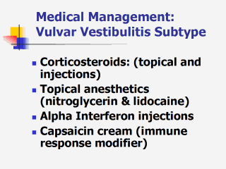 Topical nitroglycerin cream may provide temporary, safe and effective relief from pain (14). Topical lidocaine has shown promising results in some women, as it helps to break the nociceptor input to the CNS (15). Capsaicin cream, an immune response modifier imiquimod, is being tried, but efficacy data do not exist (16). (14) Walsh KE,Berman JR, Berman LA,Vierregger K.Safety and efficacy of topical nitroglycerine for treatment of vulvar pain in women with vulvodynia:a pilot study.J Gend Specif Med 2002;5:21-27 (15) New concepts in vulvodynia,Edwards,Libby MD,Am J Obstet Gynecol,Volume 189(3)Supplement,September 2003,ppS24-S30 (16) Zolnoun DA,Hartmann KE,Steege JF.Overnight 5% lidocaine ointment for treatment of vulvar vestibulitis.Obstet Gynecol 2003;102:84-87 |