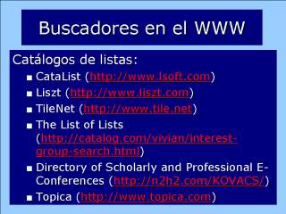 Busca listas de discusión en los LISTSERVERS que operan con el software Listserv (R) de la empresa LSoft (R). Ciertos LISTSERVERS no permiten su aparición en este catálogo, pero es un buscador útil de LISTSERVERS académicos. Las listas cuyos LISTSERVERS utilizan otro programa (Majordomo, Lyris, Mercury, Listproc, etc.), no son buscadas por CataList. Liszt Permite búsquedas por palabras y por catálogo de temas. Contiene información de listas independientemente del software que opera cada LISTSERVER. Contiene numerosas listas, y aunque no abarca todas las existentes es un recurso muy útil. Util para complementar a CataList. TileNet Busca listas de discusión independientemente del tipo de LISTSERVER, incluyendo aquellos que operan con el programa Lyris. Es útil para complementar las búsquedas de CataList. The List of Lists Busca y ofrece un catálogo por categorías para listas independientemente del tipo de LISTSERVER que operan. Directory of Scholarly and Professional E-Conferences Util por su selección exclusivamente académica. Topica Proveedor de listas de discusión gratuitas en su propio LISTSERVER. Cataloga no sólo sus propias listas, sino aquellas disponibles en el Internet sin importar el LISTSERVER. Al incorporar las listas de Topica en la búsqueda, el listado resultante puede ser muy largo, pero con muchas listas no académicas.