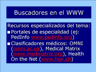 PedInfo es un portal pediátrico que incluye información sobre listas de discusión pediátricas. Clasificadores médicos generales recomendables son OMNI, Medical matrix y Health On the Net. |