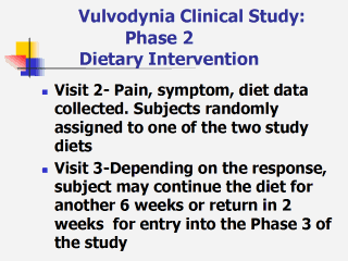 pain and symptoms diary sheets Visit 3: Collect pain, symptom and diet diaries. A Pelvic exam is done and Blood and Urine tests are sent |